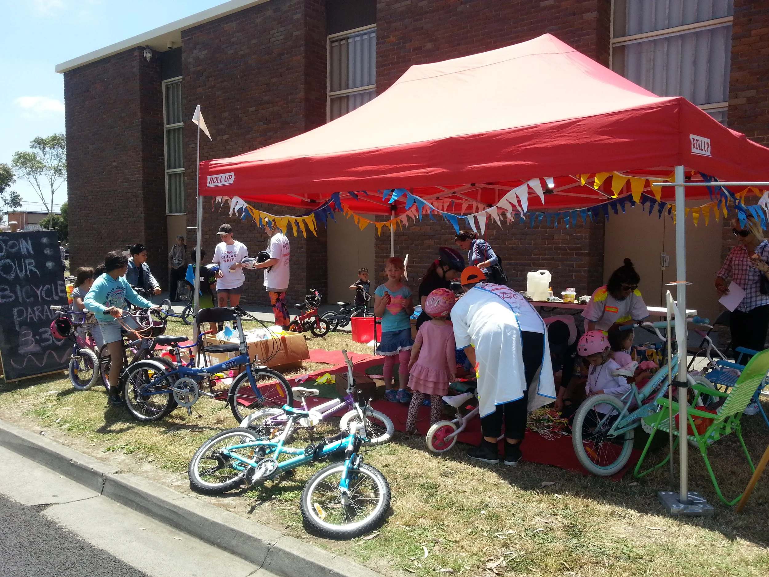 We rock up at events, venues and festivals with a marquee, our trained Bike Doctors, a hot glue gun and a mountain of flowers, dinosaurs and other decorative devices so that the kids of all ages can spend time decorating their bike (or any other wheels they have with them –scooters or pushers, we’re not snobby!), themselves or their parents, before going for a spin in a parade!